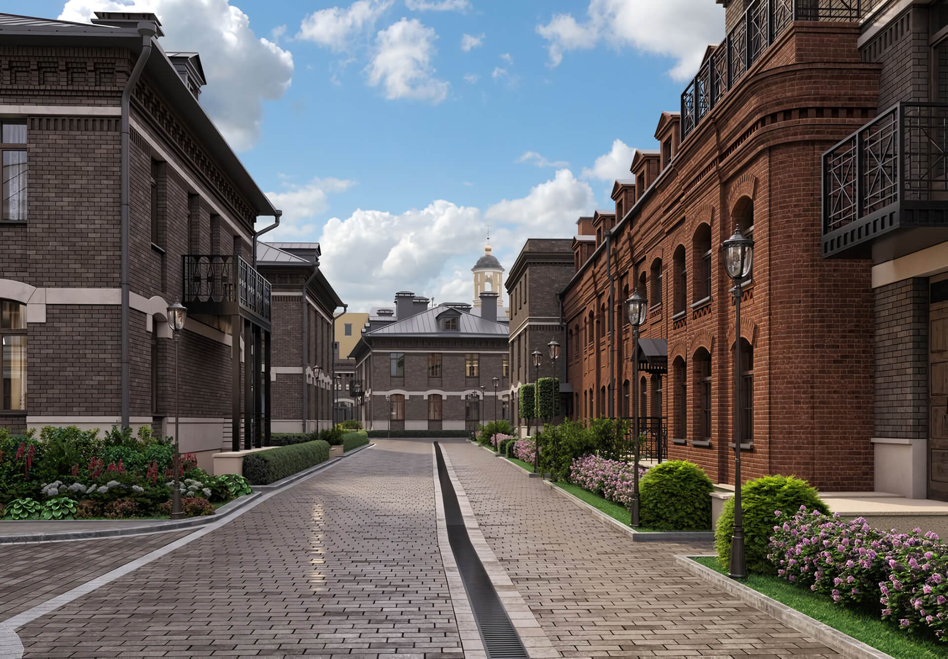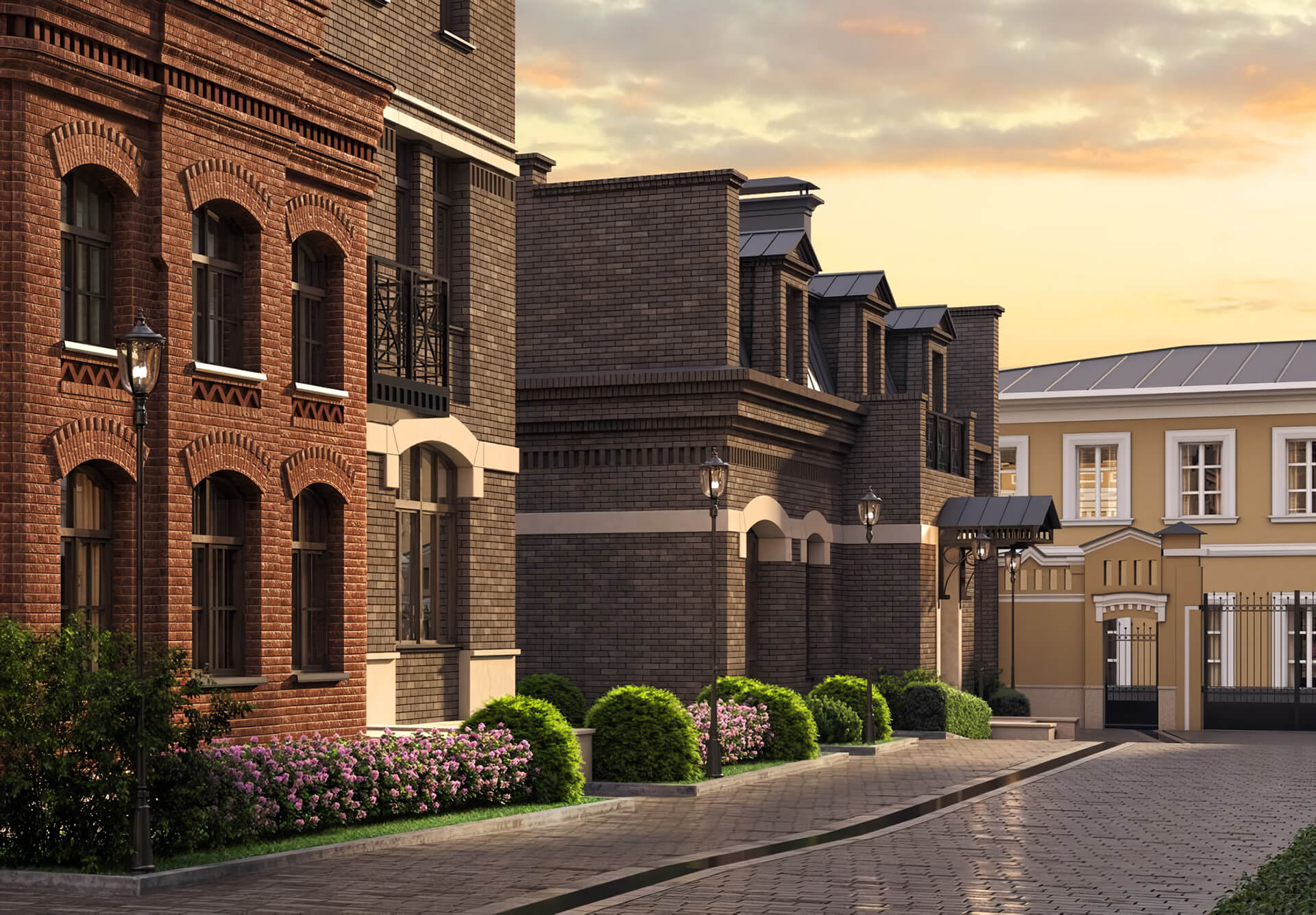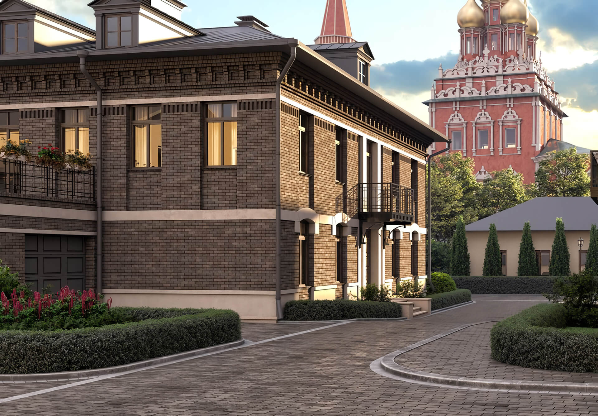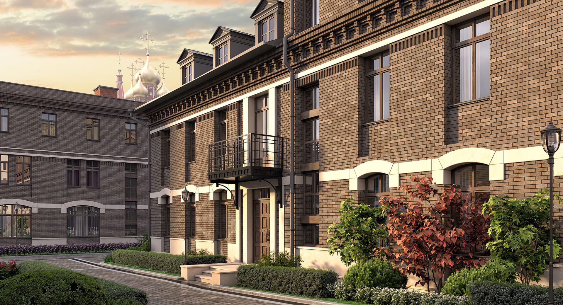 Фасады зданий облицованы кирпичом ручной формовки, создающим аутентичный вид и долговечность. Низкоэтажная застройка органично вписывается в архитектурный облик Замоскворечья, сохраняя камерность и уют.