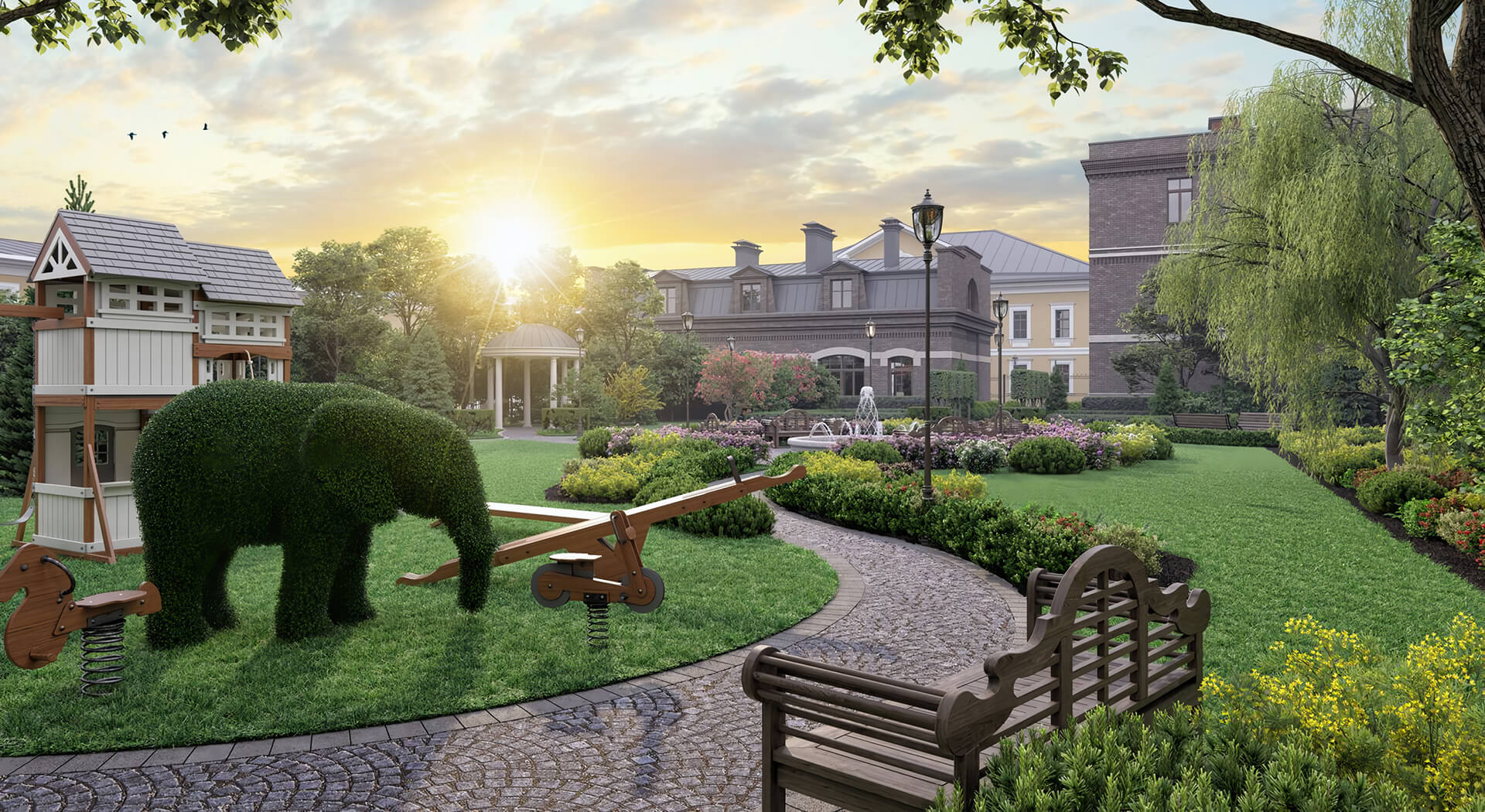 Зелёные аллеи, клумбы и скульптуры придают территории эстетичность, а уединённые зоны отдыха позволяют наслаждаться спокойствием в центре мегаполиса. Для детей оборудована безопасная и современная игровая площадка, где можно весело и активно провести время.